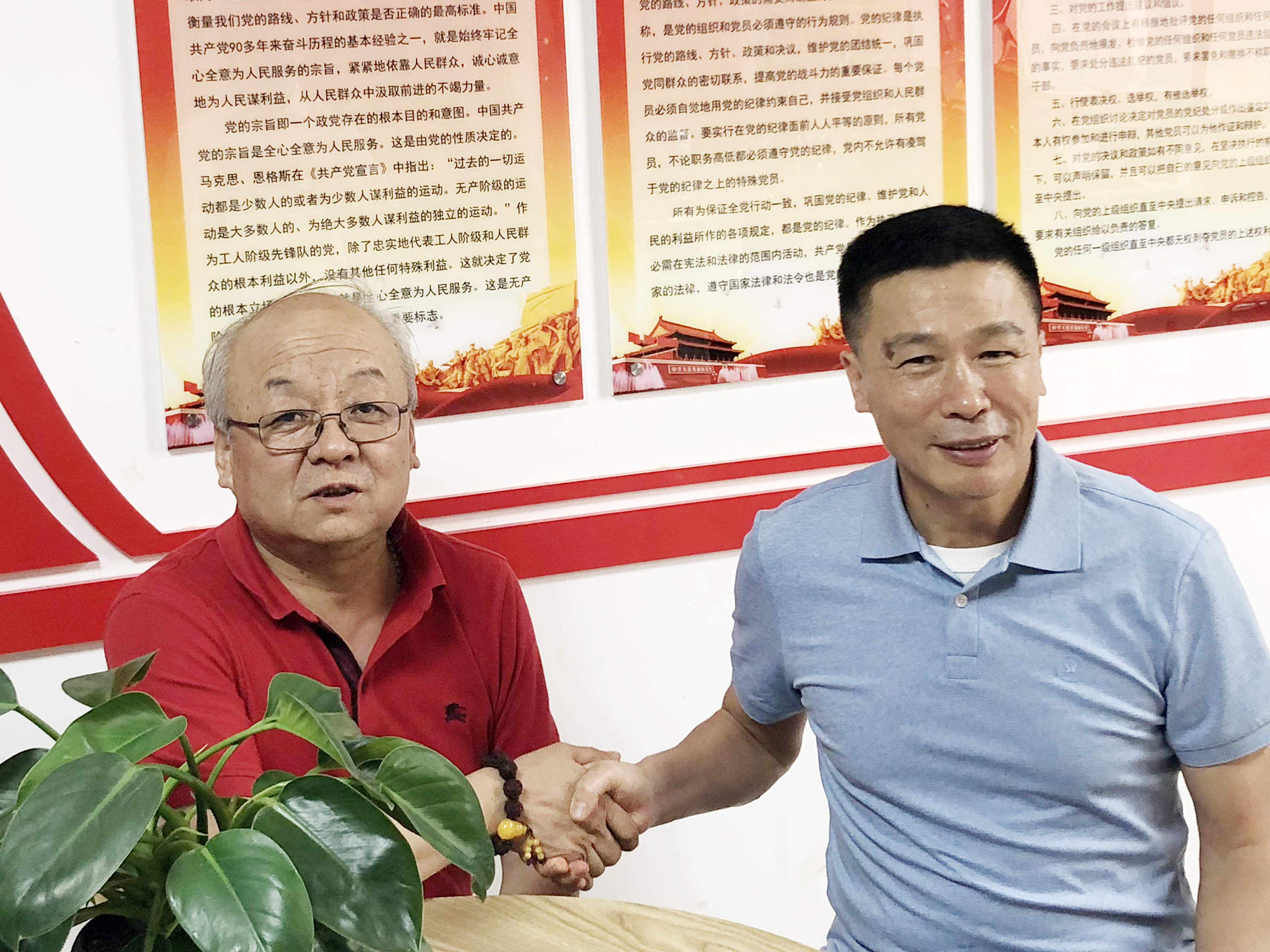 兩位領(lǐng)導(dǎo)互贈禮物,石平董事長向屠強(qiáng)會長贈送大鵬展翅雞血玉,寓意一帆風(fēng)順,屠強(qiáng)會長向石平董事長贈送了親筆書寫的“金石不渝創(chuàng)業(yè),心平氣定處事”及“茶禪”兩幅書法作品。